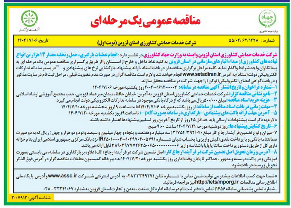 مناقصه عمومی انجام عملیات بارگیری، حمل و تخلیه مقدار14هزارتن انواع نهاده های کشاورزی استان قزوین