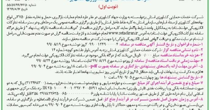 برگزاری مناقصه عملیات بارگیریی حمل وتخلیه مقدار 3750 تن انواع نهاده های کشاورزی از مبدا انبار های سازمانی استان به کلیه نقاط داخل استان در بستر سامانه تدارکات الکترونیکی دولت به آدرس Setadiran.ir صورت گرفت.
