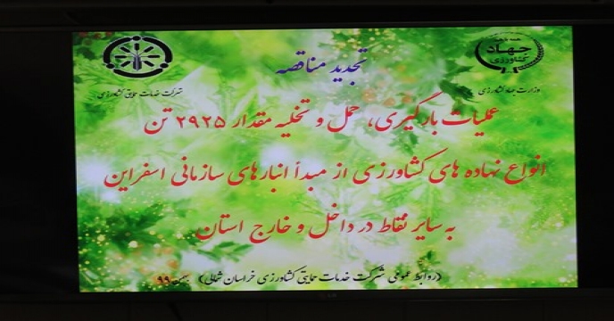 مهندس محسن نظام دوست مدیر شرکت خدمات حمایتی کشاورزی خراسان شمالی با اعلام این خبر بیان کرد روز یکشنبه  تاریخ 99/11/5 جلسه تجدید مناتقصه حمل و تخلیه مقدار 2 هزار 925 تن انواع نهاده های کشاورزی از مبداء انبار های سازمانی اسفراین به سایر نفاط در داخل و خارج استان در محل دفتر مدیریت از طریق سامانه تدارکات الکترونیک دولت برگزار و برنده مناقصه شرکت تعاونی کامیونداران شهید بهشتی اعلام گردید.