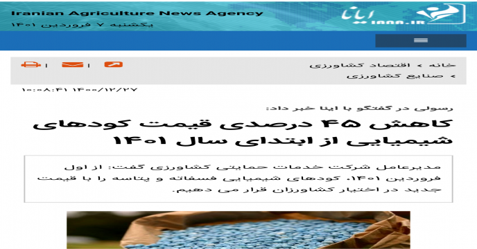 مدیر شرکت خدمات حمایتی کشاورزی استان البرز از درج خبر کاهش ۴۵ درصدی قیمت کودهای شیمیایی در خبرگزاری ایانا استان البرز خبر داد. علی اکبر ندرلو با اعلام این مطلب افزود: : متن خبر مدیرعامل شرکت در خصوص کاهش 45 درصدی کودهای فسفاته و پتاسه از ابتدای سال 1401 در خبرگزاری ایانا استان البرز لینک گردید.