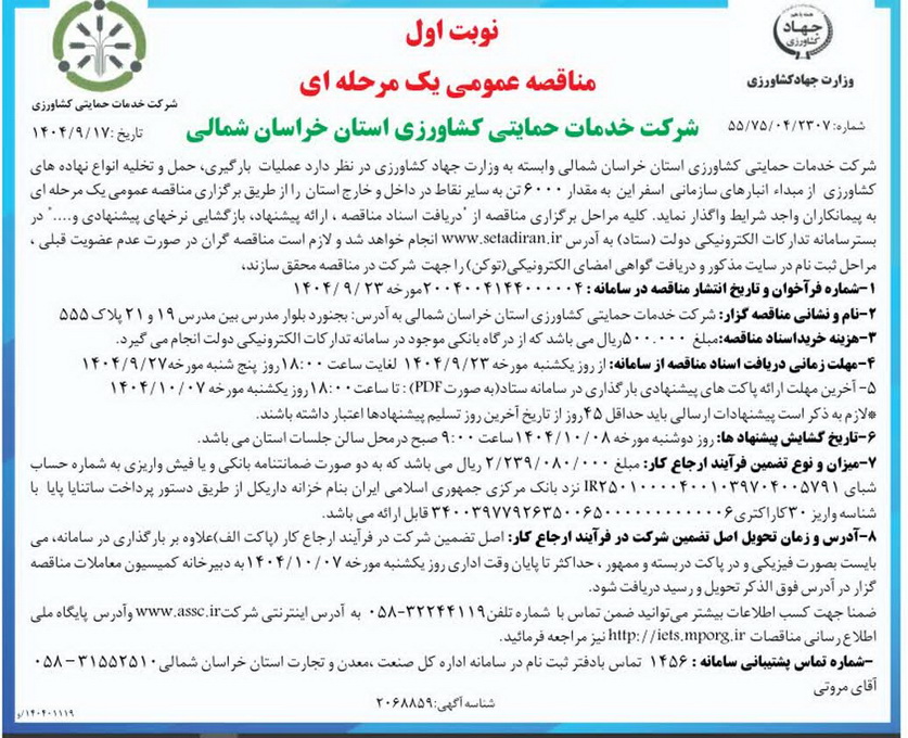 مناقصه عمومی یک مرحله یی عملیات بارگیری، حمل و تخلیه انواع نهاده های کشاورزی استان خراسان شمالی