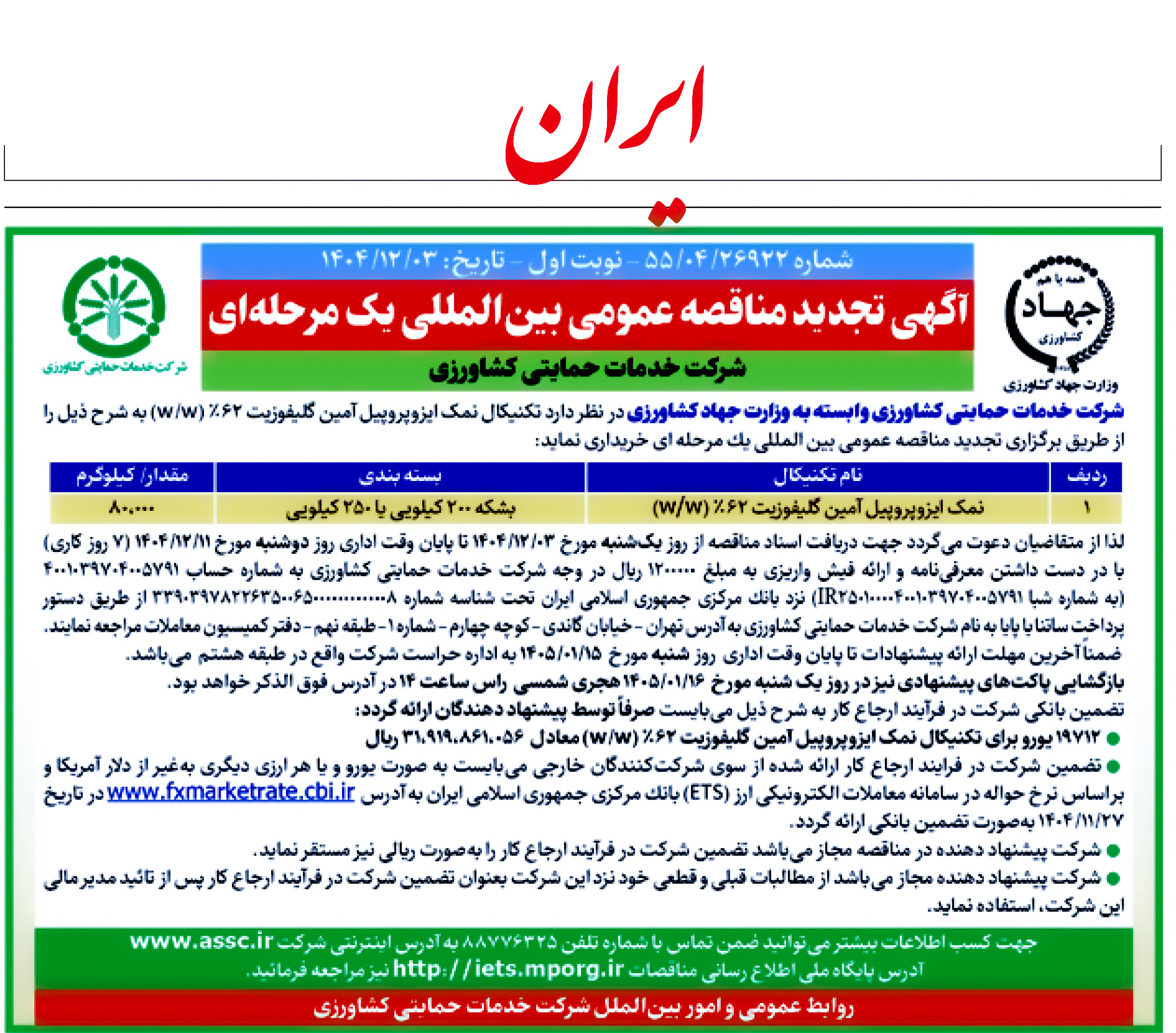 شرکت خدمات حمايتي كشاورزي وابسته به وزارت جهاد كشاورزي در نظر دارد تكنيكال نمک ایزوپروپیل آمین گلیفوزیت 62% (w/w) به شرح ذيل را از طريق برگزاري تجدید مناقصه عمومي بين المللي يك مرحله اي خريداري نمايد:
